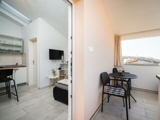 Het bestaat uit een woon- en eetkeuken, een aparte slaapkamer met een tweepersoonsbed en een badkamer met douche. Het bevindt zich op de eerste verdieping.