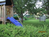Aangrenzende tuin met kinderspeeltoestellen, ligplaats en tuinset onder de fruitbomen. Mogelijkheid tot barbecueën in de tuin, in overleg.